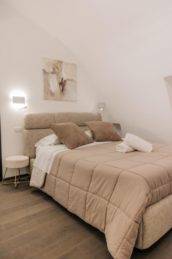 La suite matrimoniale, arredata con attenzione ai dettagli, offre un’atmosfera calda e rilassante, perfetta per un soggiorno romantico o un momento di puro relax. La suite dispone di una bellissima vasca idromassaggio ideale per concedersi un bagno rigenerante e una doccia mosaico con cromoterapia per un’esperienza sensoriale unica. Ogni elemento della suite è pensato per offrire il massimo del comfort e della tranquillità.